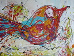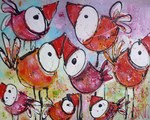 2014veel verfgebruik .Vogels zijn abstract kinderlijk weergeven door gebruik van veel warme felle kleuren en eenvoudige vormen ,die met spatel en veel verf op het doek is aangebracht