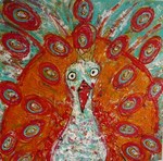 2014pauw pauw is een opvallend schilderij door de dikte van de verf , verwerken van glitter in de veren . de oranje veren geven het geheel een kleurrijk tintje